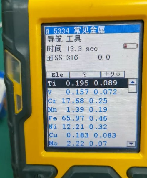 例如,“%”很容易理解,就是這個元素占這個樣品所檢測出的元素含量成分的百分之多少,比如像這個316樣品,鈦(Ti)的含量就是百分之0.195。