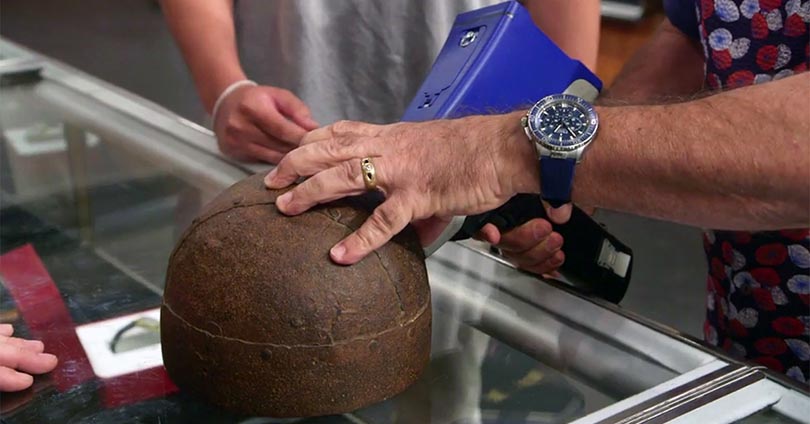 在這一期節(jié)目中,一位顧客帶來了一個(gè)被認(rèn)為是鐵做的頭盔。一位專家證實(shí),這是一個(gè)約有1500年歷史的真正的盎格魯-撒克遜頭盔。這頂頭盔完好無損,是一件非常罕見的古董。通常情況下,鐵會(huì)在有氧氣存在的環(huán)境中分解,因此這個(gè)頭盔很可能被遺留在如沼澤或河流等的缺氧環(huán)境中而得以完好保存。