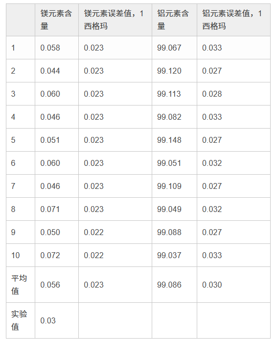 下面的圖表表明,快速對(duì)每個(gè)樣本進(jìn)行了10次檢測(cè)而獲得的平均結(jié)果,圖中的誤差線表明來自10次檢測(cè)的1西格瑪報(bào)告誤差值的+/-平均值。在鎂元素含量大于0.4%的情況下,要檢測(cè)到所顯示的鎂元素含量值,使用40 kV光束時(shí)的檢測(cè)時(shí)間是3秒鐘,而使用13 kV光束的檢測(cè)時(shí)間只需要5秒鐘。在鎂元素含量為0.21%的情況下,使用13 kV光束時(shí)的檢測(cè)時(shí)間會(huì)增加到20秒鐘。要匯報(bào)AL1100合金中0.03%的鎂元素痕量水平,使用13 kV光束時(shí)的檢測(cè)時(shí)間會(huì)增加到60秒鐘。
