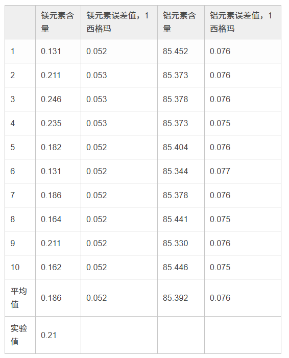在檢測(cè)牌號(hào)為1100的鋁合金時(shí),使用40 kV光束進(jìn)行3秒鐘檢測(cè),以及使用13 kV光束進(jìn)行60秒鐘檢測(cè),所得到的結(jié)果。