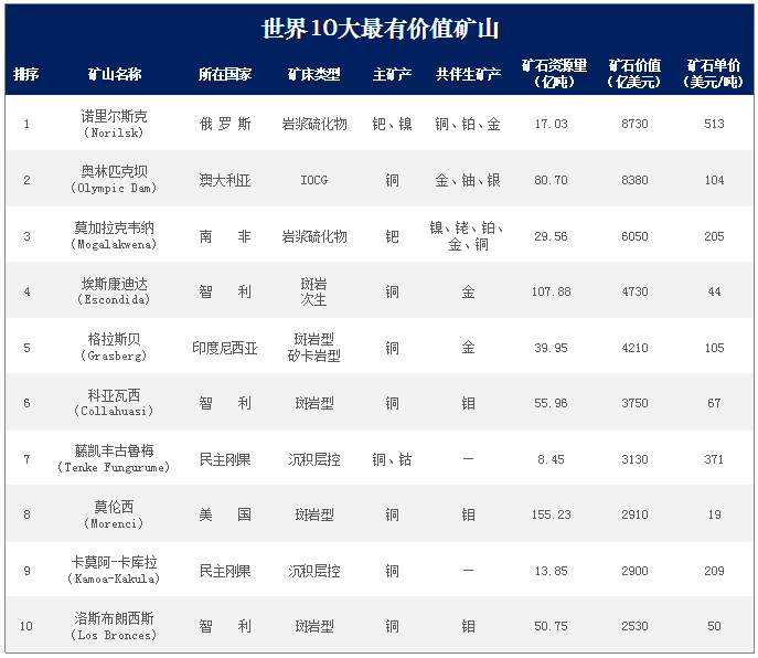 利用關(guān)聯(lián)公司礦業(yè)情報(bào)(MiningIntelligence)的數(shù)據(jù),按照現(xiàn)行價格,Mining.com網(wǎng)站計(jì)算了礦山資源總價值,并列出了世界10大在產(chǎn)賤金屬和貴金屬礦山。