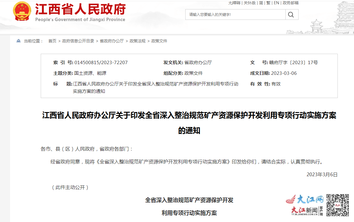 日前,江西省人民政府在其官方網(wǎng)站上發(fā)布了《全省深入整治規(guī)范礦產(chǎn)資源保護(hù)開發(fā)利用專項(xiàng)行動實(shí)施方案》(下稱《方案》),從礦業(yè)權(quán)設(shè)置審批、礦山開采監(jiān)管、規(guī)范礦山企業(yè)經(jīng)營、礦山生態(tài)修復(fù)、建設(shè)綠色礦山、礦山安全生產(chǎn)和產(chǎn)業(yè)鏈供應(yīng)鏈安全等方面提出了六大措施,深入整治規(guī)范礦產(chǎn)資源保護(hù)開發(fā)利用。