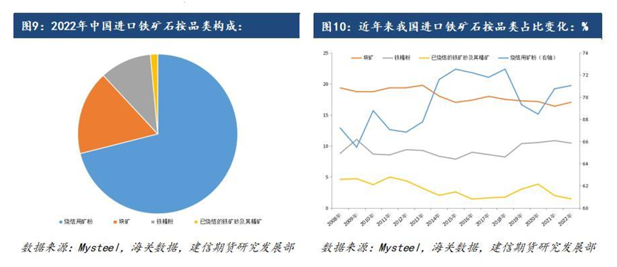 從進口品類來看,我國燒結用粉礦占比最高,2022年占比約為71.0%;塊礦居次,占比約為17.0%;鐵精粉第三,占比約為10.5%;已燒結的鐵礦砂占比最小僅為1.5%。