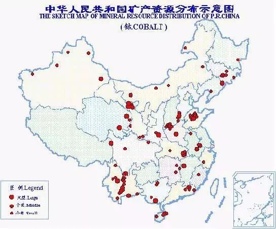 中國(guó)鈷礦資源不多,獨(dú)立鈷礦床尤少,主要作為伴生礦產(chǎn)與鐵、鎳、銅等其他礦產(chǎn)一道產(chǎn)出。已知鈷礦產(chǎn)地150處,分布于24個(gè)省(區(qū)),以甘肅省儲(chǔ)量最多,約占全國(guó)總儲(chǔ)量的30%。全國(guó)總保有儲(chǔ)量鈷47萬(wàn)噸。
