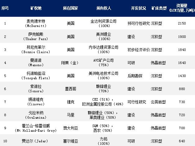 根據(jù)總資源量(LCE,碳酸鋰當量,萬噸,以下同),Mining Intelligence網(wǎng)站列出了世界前十大粘土和硬巖鋰礦。