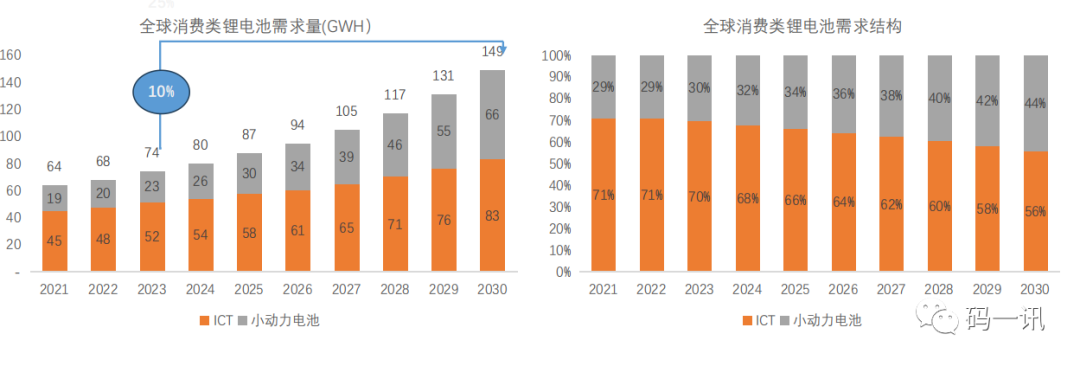 參考多個(gè)機(jī)構(gòu)數(shù)據(jù),未來(lái)消費(fèi)類電池需求以10%增速發(fā)展,預(yù)計(jì)30年總體需求144GWh, 其中ICT占56%份額,小型動(dòng)力電池44%;