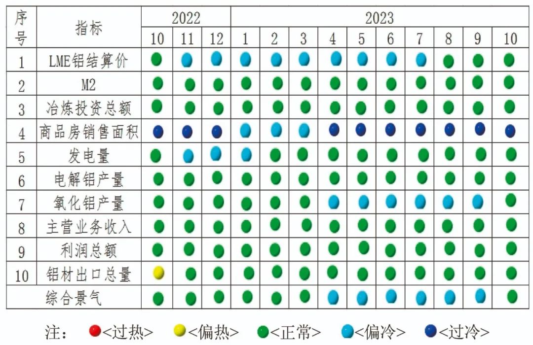 由中國鋁冶煉產業景氣信號燈(見圖2)可見,2023年10月份,在構成產業景氣指數的10個指標中,LME鋁結算價、M2、發電量、電解鋁產量、鋁冶煉投資總額、氧化鋁產量、主營業務收入、鋁材出口總量和利潤總額等9項指標均處于“正常”區間;商品房銷售面積處于“過冷”區間。