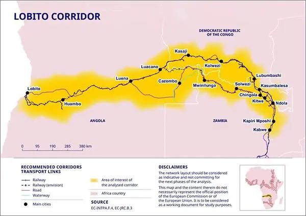 美歐積極推進洛比托走廊建設。洛比托走廊項目被定位為G7“全球基礎設施和投資伙伴關系”倡議(PGII)在非洲的旗艦項目。走廊的主線路段均為已建成的鐵路,例如,安哥拉境內長達1344公里的本格拉鐵路線,是2015年在中資企業建設下恢復通車的;走廊的剛果(金)段和贊比亞段早期由歐洲殖民者所建造,但大部分路段年久失修,處于半廢棄狀態。