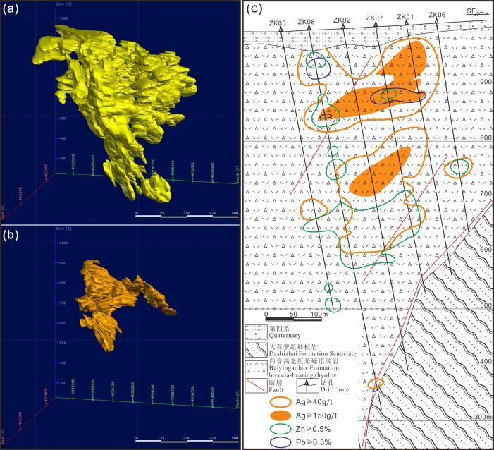 值得注意的是,布敦烏拉銀礦如按照銀工業(yè)品位的2-3倍作為富礦邊界指標(biāo)進(jìn)行富礦塊段的圈定(采用150 g/t),可獲得富銀礦石量1600萬(wàn)噸,平均品位達(dá)350 g/t,可與墨西哥高品位銀礦相媲美,展現(xiàn)出極高的經(jīng)濟(jì)價(jià)值。