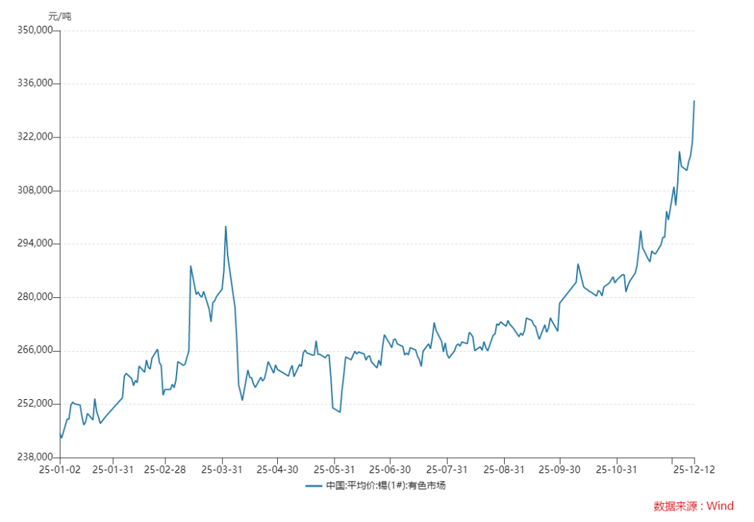 12月12日,國內現(xiàn)貨錫價在突破每噸33萬元整數(shù)關口后繼續(xù)上行,Wind數(shù)據(jù)顯示,錫(1#)當日報價達331,640元/噸,單日上漲10,870元,年內累計漲幅約37%,價格攀升至2022年6月以來的最高位。同期,滬錫期貨主力合約亦大幅收高,市場看漲情緒顯著。